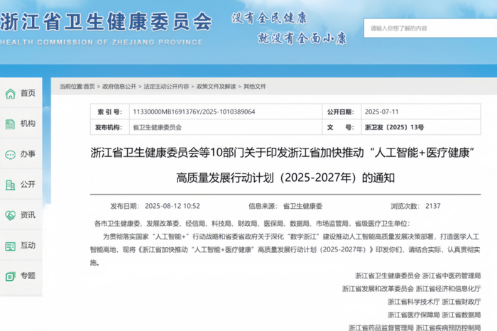 就在今年8月浙江省衛健委發布的《浙江省加快推動“人工智能+醫療健康”高質量發展行動計劃(2025—2027年)》(以下簡稱《行動計劃》),為浙江的智慧醫療發展繪制了一幅更宏大、更系統的藍圖——到2027年,全面建成國家人工智能醫療行業應用基地,讓AI深度融入醫療健康全鏈條,讓優質服務觸達每一個角落。