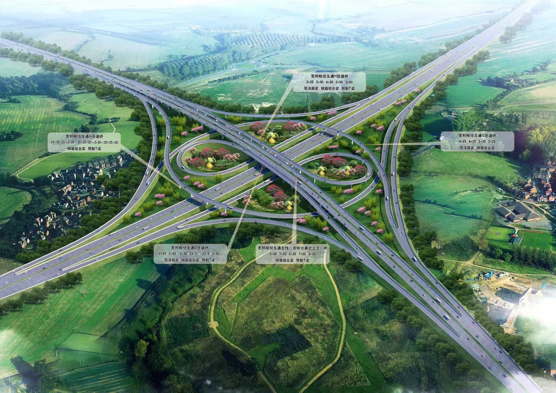 鞍山至臺(tái)安高速公路寬邦樞紐互通位于臺(tái)安縣西側(cè),采用對(duì)角雙環(huán)苜蓿葉形立交方案,為全線控制性工程之一。主線起于K57+030處,止于K57+689.5,主線總長(zhǎng)度659.5m,共設(shè)A、B、C、D、E、F、G、H八條匝道,與京沈高速關(guān)聯(lián)長(zhǎng)度2010m,主要結(jié)構(gòu)為大中小橋6座(包括互通匝道橋)、涵洞及通道17道、路基填方約134萬(wàn)方,橋梁工程主要包括樁基232根、承臺(tái)26個(gè)、墩臺(tái)身178個(gè)、蓋梁83個(gè),預(yù)制T梁210片、鋼混組合梁12孔、現(xiàn)澆箱梁25孔。