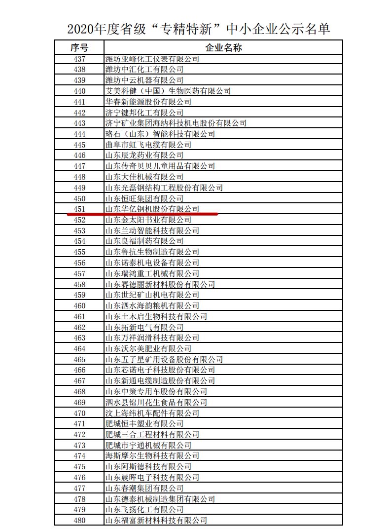 近日,省工信廳最新公示的2020年度省級“專精特新”中小企業(yè)名單,山東華億鋼機(jī)股份有限公司位列其中。