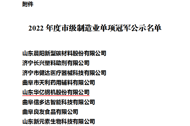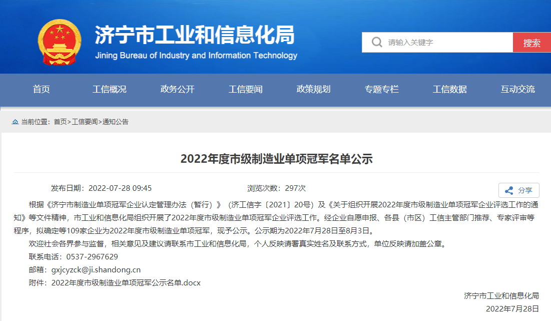 近日,濟(jì)寧市工業(yè)和信息化局組織開(kāi)展了2022年度市級(jí)制造業(yè)單項(xiàng)冠軍企業(yè)評(píng)選工作。經(jīng)企業(yè)自愿申報(bào)、各縣(市區(qū))工信主管部門(mén)推薦、專(zhuān)家評(píng)審等程序,2022年7月28日,濟(jì)寧市工業(yè)和信息化局公布了《2022年度市級(jí)制造業(yè)單項(xiàng)冠軍公示名單》,公司成功入選公示名單。